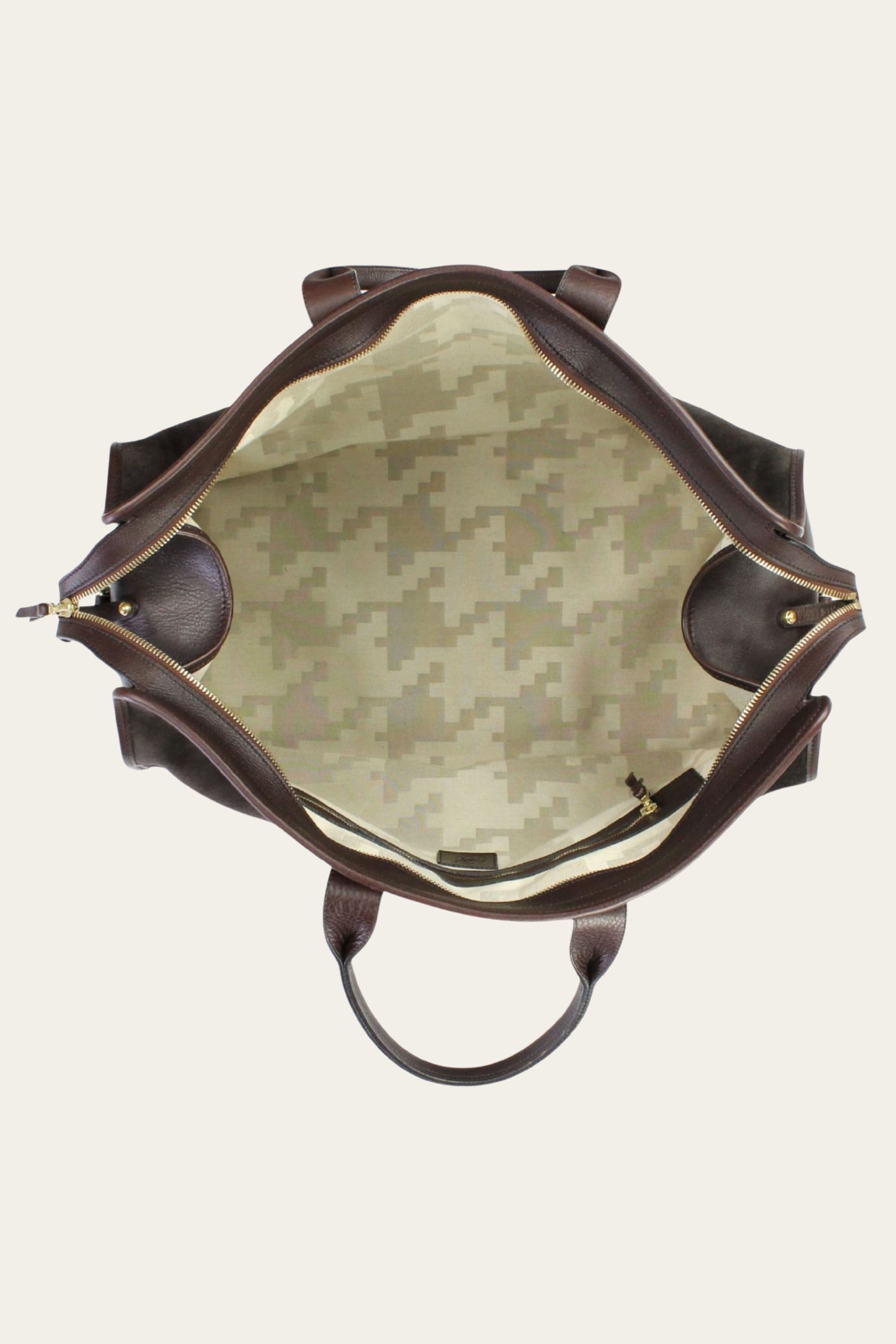 Over the past 50 years, Frank Clegg has crafted many versions of the classic duffle bag, and I’ve owned and tested at least five different shapes and sizes. After years of personal research, I found the Compass duffle to be the most practical and versatile. Originally designed as an outdoor log carrier in the 1970s, this larger style is about the maximum size allowed for carry-on travel—perfect for those who never check a bag. It’s spacious enough to live out of for up to a week, comfortably fitting two pairs of shoes and a smart capsule wardrobe (if you're an AOS reader, you get it). For the AOS version, we added exterior pockets on each side for quick access to your phone and passport, finishing it with our signature houndstooth lining.